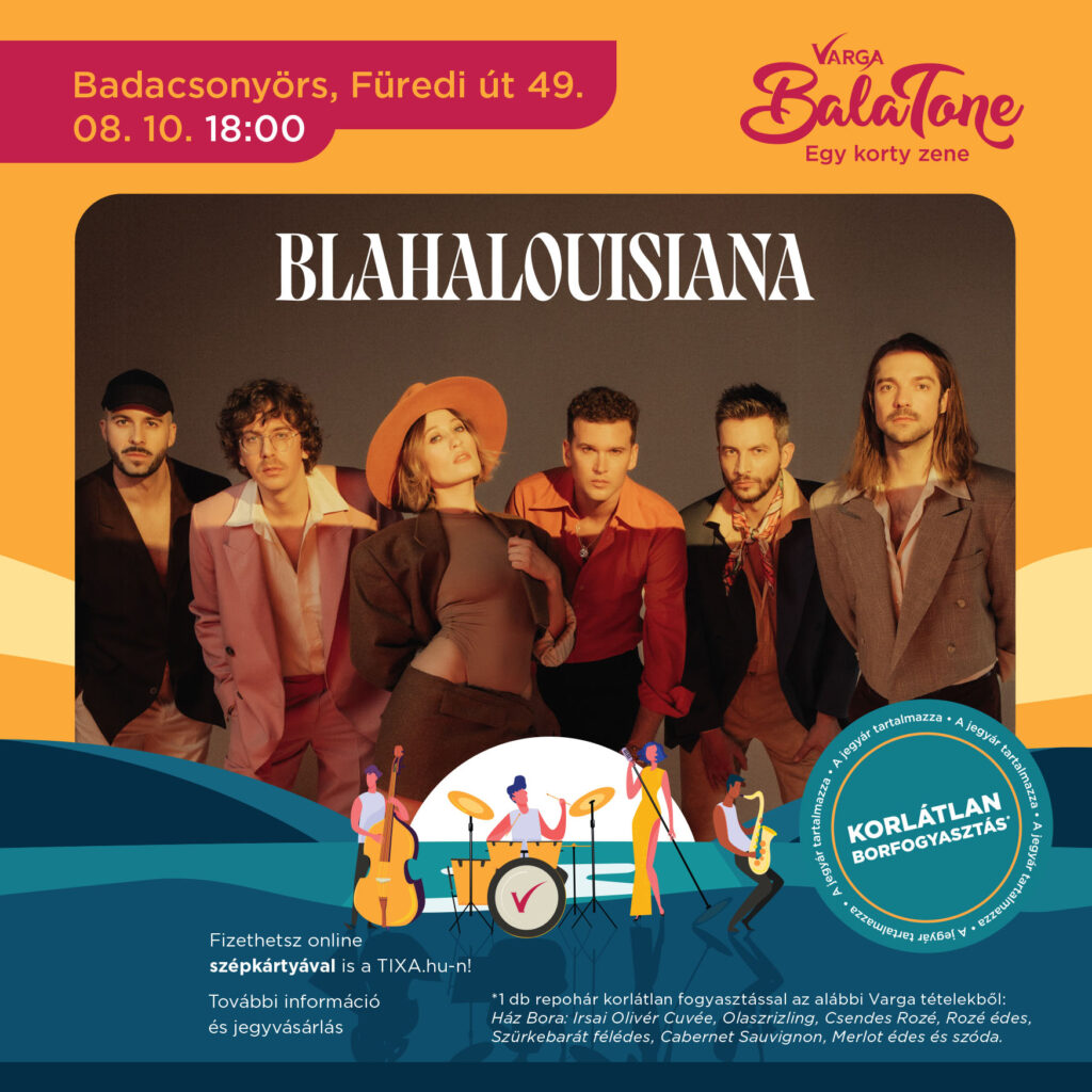 2025. augusztus 10-én a badacsonytomaji Varga Pincészetbe várnak minden zene- és borrajongót. Az este a hazai alternatív-pop-rock színtér egyik legkarakteresebb zenekarával, a Blahalouisianával indul. A formáció 2012 óta aktív, és különleges hangzásvilágával, valamint frontemberük, Schoblocher Barbara lehengerlő színpadi jelenlétével gyorsan belopta magát a közönség szívébe. Dalaikban keveredik a vintage rock hangulat, a modern popos ritmus és a lélekkel teli, magyar nyelvű dalszövegek. A Blahalouisiana igazi koncertzenekar – dinamikus előadásaik garantáltan magukkal ragadják a hallgatóságot.